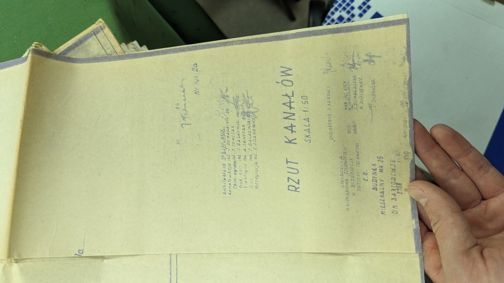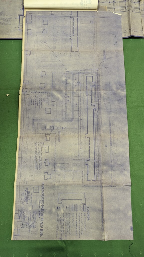 Same tylko dokumenty dotyczące mrówkowców, to kilkanaście wielkich pudeł, pełnych skoroszytów. A z nich wynika, że dosłownie każda ściana, każdy strop, podłoga, drzwi (wyobraźcie sobie, że w oryginalnym projekcie, w wieżowcach było 9 rodzajów drzwi i każdy miał dla siebie wybrane miejsce!), mają swoje odpowiednie parametry. Nie mówię już nawet o fundamentach, kanalizacji, instalacjach gazowych, wentylacji i innych, bo do każdej znajdziemy szereg opisów, obliczeń i rysunków. Mi najbardziej spodobały się wielkie schematy, obrazujące cały blok lub ogólne plany zagospodarowania przestrzennego (na niektórych widać oba mrówkowce, a nawet fragment glinianki). Te wielkie rysunki utworzono na ogromnych, rozkładanych niby harmonijka arkuszach, w całości osiągających rozmiary nawet 2 metrów długości.