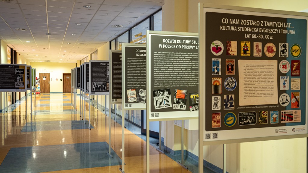To oczywiście nie wszystko, bo funkcję przestrzeni wystawienniczej pełnią także szerokie korytarze gmachu. Na półpiętrach stoją rzeźby sztuki współczesnej (przypominające nieco wycięte w lodzie bryły) autorstwa Pauliny Kaczor-Paczkowskiej. Na 1 piętrze znajduje się z kolei interesująca wystawa wspomnień z życia i kultury studenckiej Bydgoszczy i Torunia. Rzecz dotyczy lat 60., 70. i 80. XX wieku, toteż znaleźć można tutaj wiele ciekawych fotografii i tekstów. W tym miejscu, nikt nie będzie Was obwiniał, jeśli rzucicie stwierdzeniem: „Kiedyś to było!”.