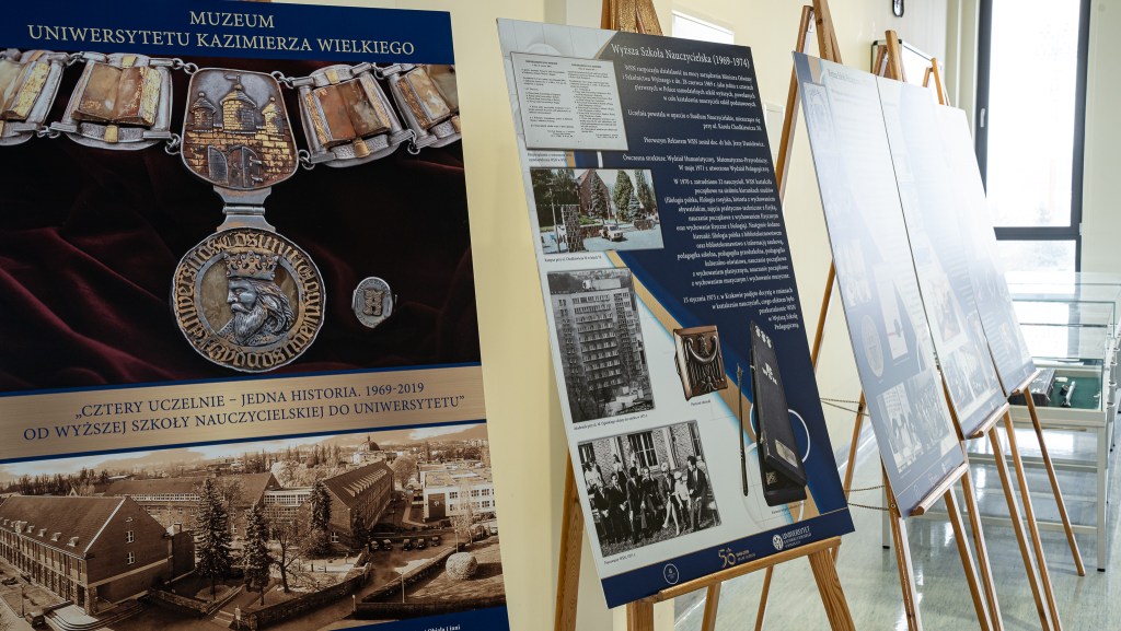 Są więc pamiątkowe plansze, przybliżające historię Uczelni, są archiwalne zdjęcia, piękny sztandar (jeszcze Akademii Bydgoskiej), liczne nagrody (zarówno indywidualne, jak i grupowe – choćby puchar Rektora UKW za I miejsce w XVI Wielkiej Wioślarskiej, kiedy to uczelnia ścigała się – skutecznie – z osadą z Oxfordu). Jest pamiątkowy „wędrowiec”, a więc miniaturka rzeźby autorstwa Michała Kubiaka (oryginał stoi przy skrzyżowaniu ulic: Dworcowej i Gdańskiej), wręczony władzom UKW przez prezydenta miasta, Rafała Bruskiego z okazji 50-lecia działalności. Historii jest więc tutaj sporo, a pieczę nad nią sprawują dwa, ubrane w stroje rektorów, manekiny.
