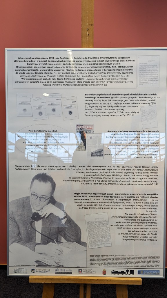 W związku z tym, w gmachu znajduje się wystawa „Andrzej Szwalbe – Wielki Budowniczy Bydgoszczy”. Znajdziecie tutaj m.in. oryginalne pisma, autorstw Szwalbego, z których przebija się wizja utworzenia w Bydgoszczy uniwersytetu. Pisał w tej sprawie do naukowców, pisał do władz samorządowych i państwowych. Warto wspomnieć, że w 1994 roku znalazł się w Społecznym Komitecie ds. Powołania Uniwersytetu w Bydgoszczy. A że miał siłę przebicia, z pewnością nazwać można go jedną z osób „odpowiedzialnych” za jego powołanie. Szkoda, że doczekał tylko powstania Akademii w 2000 roku. Niestety, zmarł w 2002 roku, podczas gdy status uniwersytetu uczelnia uzyskała w roku 2005.