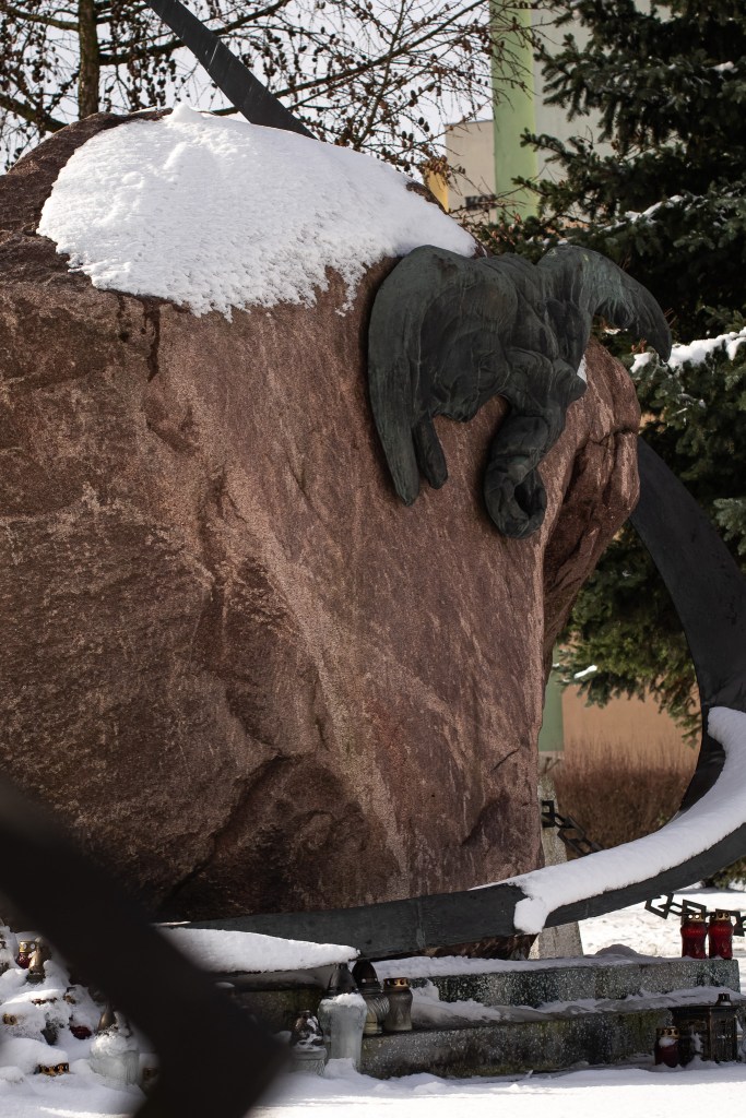 Nieco bardziej kameralny klimat panuje na skwerze im. Władysława Dunarowskiego (patron był bydgoskim pisarzem, prezesem oddziału Związku Literatów Polskich). Tutaj mamy znacznie więcej drzew, które w sezonie letnim zapewniają przyjemny cień. Są też utrzymane w starym stylu kwietniki oraz plac zabaw. Od zachodu, skwer zamyka kolejna ważna konstrukcja, czyli „mrówkowiec”. I tutaj znajduje się pomnik, czyli kamienne wyobrażenie… gołębia. Co prawda niektórym wydaje się, że to bardziej orzeł, ale jestem niemal przekonany, iż autorowi chodziło o gołębia.