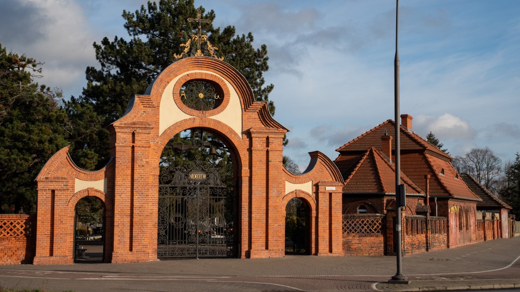 Sławski przygotował więc projekt: bramy, ogrodzenia, a także zabudowań, znajdujących się na południu nekropolii. Na bramie po dziś dzień dostrzeżecie – zapisaną rzymskimi cyframi – datę 1906 (MDCCCCVI), tj. moment oddania do użytku cmentarza. Po prawej stronie od wejścia stoją zaś budynki dawnej: remizy i domu grabarza, dziś pełniące funkcje mieszkaniowo-biurowe. Z tego co wiem, zarządca cmentarz wciąż tutaj mieszka.