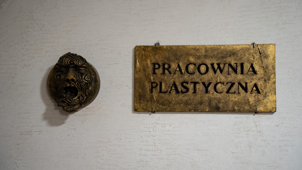 Zresztą, a propo obrazów, w tych murach jest naprawdę dużo sztuki! Poza Królową z parteru, bodaj największym obrazem jest ten, wiszący na pierwszym piętrze, tuż obok auli, ukazujący właśnie gmach „Królówki”. Poza tym, w wielu innych przestrzeniach dostrzec można malunki na ścianach: a to jakąś rajską wyspę, a to fiata 126 p., a to sportowców – największe ich zagęszczenie znajdziecie w łączniku z halą sportową, a – z tego co wiem – część z nich to dzieła uczniów. Generalnie bardzo wyraźnie czuć tutaj ducha artyzmu, najbardziej zaś na poddaszu, gdzie znajduje się sala plastyczna (tutaj na ścianie widnieje kolejny malunek). Ta przestrzeń była prawdopodobnie przeznaczona na zajęcia plastyczne od samego początku, a więc jeszcze w czasach niemieckiego seminarium nauczycielskiego.