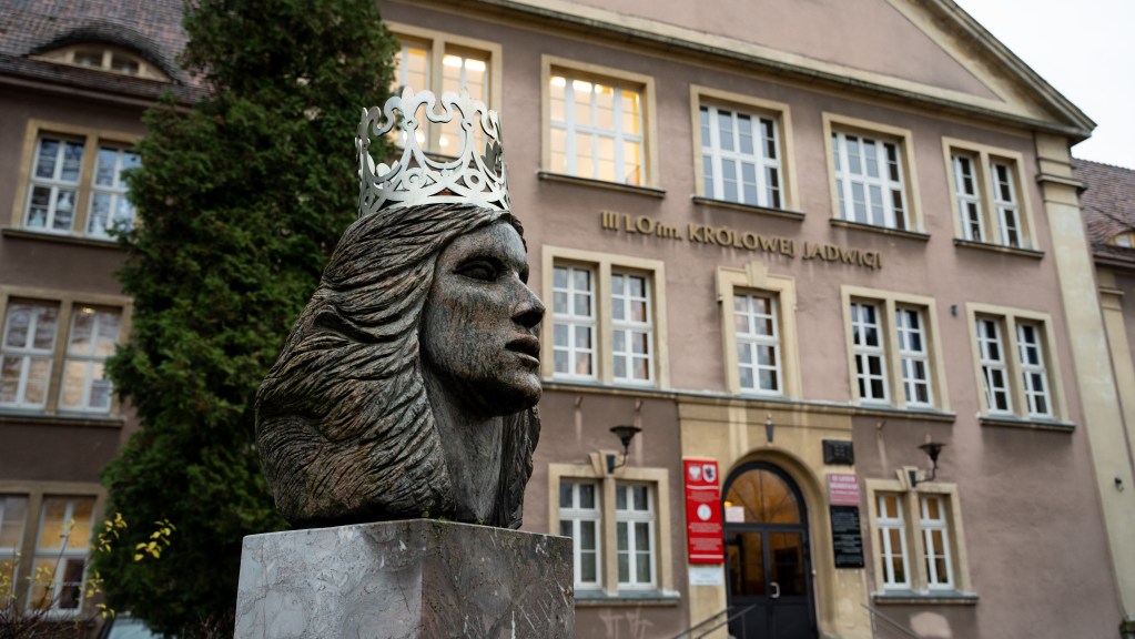 No ale zaraz? Żadnego upamiętnienia patronki szkoły, czcigodnej Jadwigi Andegaweńskiej? Nic z tych rzeczy – jest tutaj jej popiersie, czy też raczej dumnie spoglądająca przed siebie głowa w koronie. Rzeźba stanęła w tym miejscu z okazji 20-lecie III LO, w 2010 r., a jej autorem był inowrocławski artysta, Marcin Fołda. To ten sam człowiek, który jest namalował Kazimierza Konradowica, zdobiącego kamienicę, stojącą naprzeciwko kościoła farnego pw. św. Mikołaja. Pana Marcina miałem – przez czysty przypadek – okazję spotkać w trakcie przygotowywania zdjęć do artykułu, nie mając jednocześnie pojęcia, z kim mam do czynienia. Jeśli więc Pan to czyta, pozdrawiam i składam wyrazy szacunku!