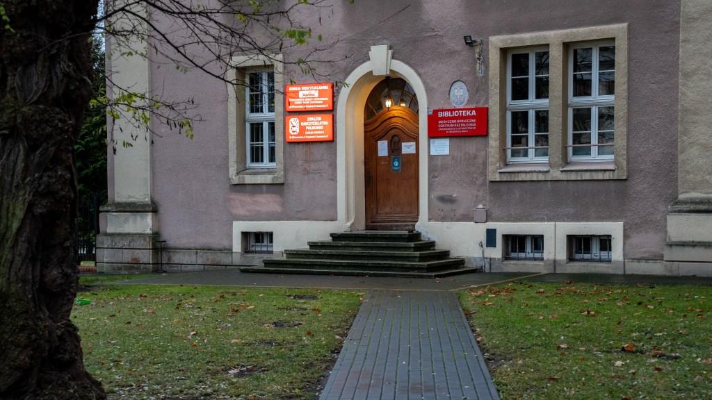 Wróćmy jednak przed budynek. Nad głównym wejściem króluje wielgachny fronton, pod którym umieszczono napis informujący nas, z jaką szkołą mamy do czynienia. Co ważne – i czego bardzo brakuje w wielu miejscach – tuż przy drzwiach wejściowych wmurowano tablicę z historią obiektu i nazwami wszystkich polskich instytucji, działających tutaj na przestrzeni lat. Super, bardzo pochwalam!