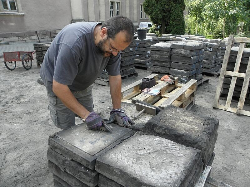 Na chwilę (i na sam koniec materiału) wróćmy do historii, bo nie sposób zapomnieć o tym co okupanci zrobili w najbliższym otoczeniu budynku. Wspomniałem wyżej o przebudowie gmachu i likwidacji sali gimnastycznej, ale nie dodałem, że przed budynkiem powstał wybrukowany plac. Ten był wykorzystywany w celach propagandowych, np. jako miejsce wystąpień. Najbardziej tragiczne jest jednak to, czym placyk został wybrukowany. A były to fragmenty żydowskich nagrobków, czyli macewy.