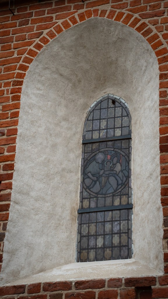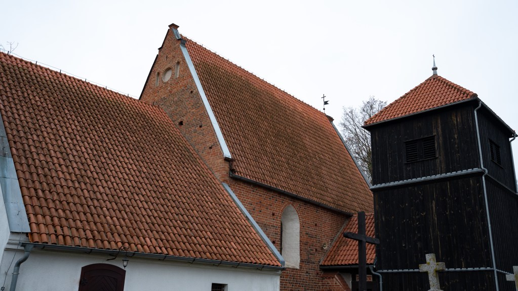 Ale po kolei. Mówimy o naprawdę małej, ceglanej konstrukcji – prawdziwej gotyckiej katedrze, ale w wersji mini. Jest to konstrukcja jednonawowa, przykryta spadzistym dachem, z prezbiterium zdecydowanie wyróżniającym się na tle pozostałej części obiektu (młodsze, niższe, również przykryte dachem spadzistym). W tylnej części obiektu mamy jeszcze otynkowaną (to jedyny taki element) zakrystię. Ta ostatnia stanowi rozszerzenie prezbiterium w kierunku północnym, co tworzy dość nietypowy kształt (powiększenia dokonano nie na długości, a na szerokości).