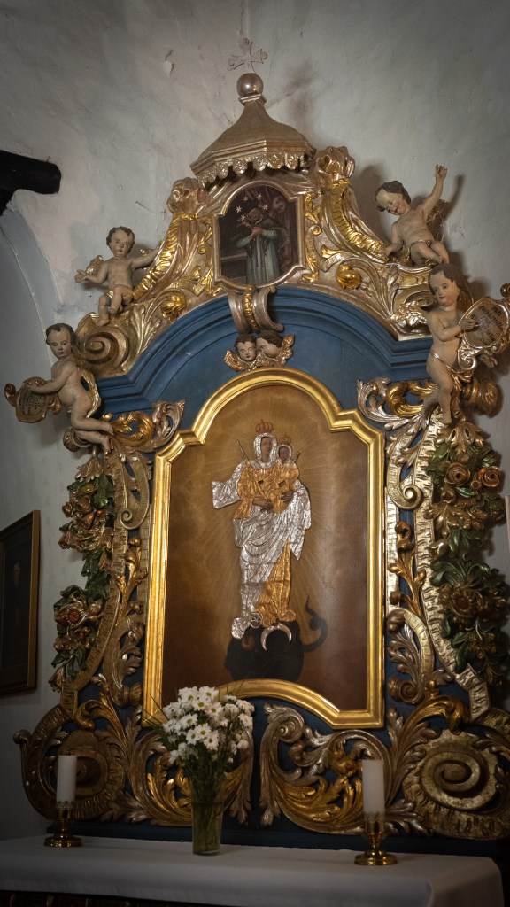 Mimo to, i w tej przestrzeni znalazło się miejsce na chór! Drewniana i bardzo malutka, konstrukcja została umieszczona centralnie nad wejściem do świątyni. Na nim znajdują się niewielka organy. Kiedy jednak spojrzymy wyżej, na sklepienie, dostrzeżemy piękne kasetony, wypełnione kształtami geometrycznymi i kwiecistymi. Całość utrzymana została w ciemnych barwach.
