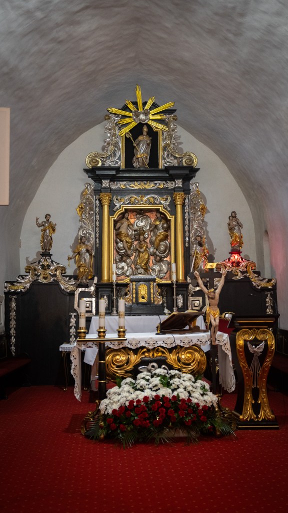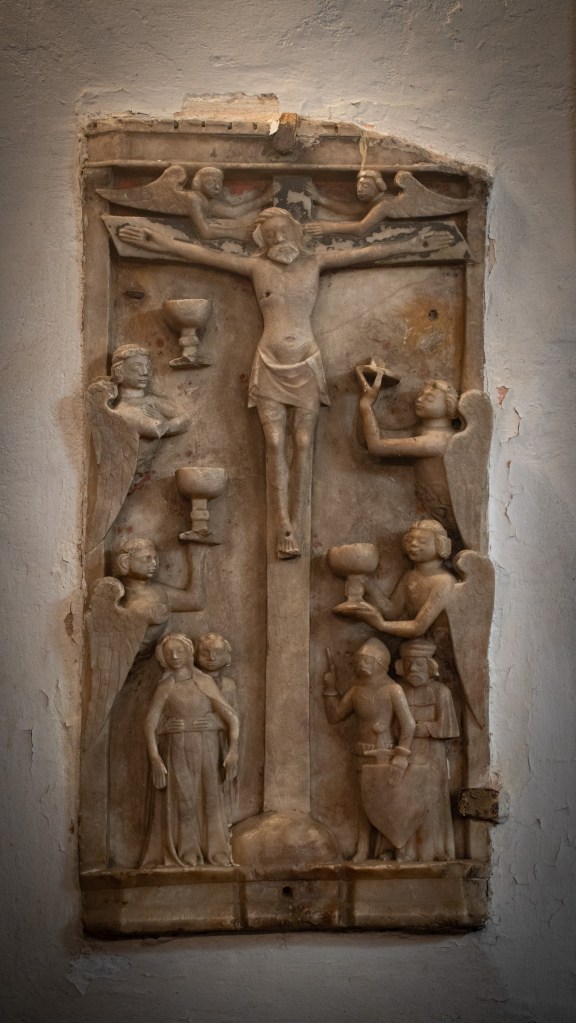 Najstarszy element wystroju to jednak płyta/płaskorzeźba z 1535 roku (tak przynajmniej wskazuje data, którą znajdziecie u jej dołu, choć niektórzy uważają, że jest jeszcze starsza). Ukazano na niej scenę ukrzyżowania Jezusa, wokół którego znajdują się postacie z wyciągniętymi kielichami – jakby próbująca złapać w nie boską krew. U dołu znajduje się także postać podtrzymywanej przez kogoś Maryi, a także postacie, które (zdaje się) wydają wyrok na Chrystusa. Czym jest ta płyta? Czy to dawna płyta nagrobna, czy po prostu element wystroju świątyni? Nie wiem i z pewnością tego teraz nie rozstrzygniemy.