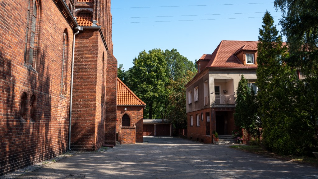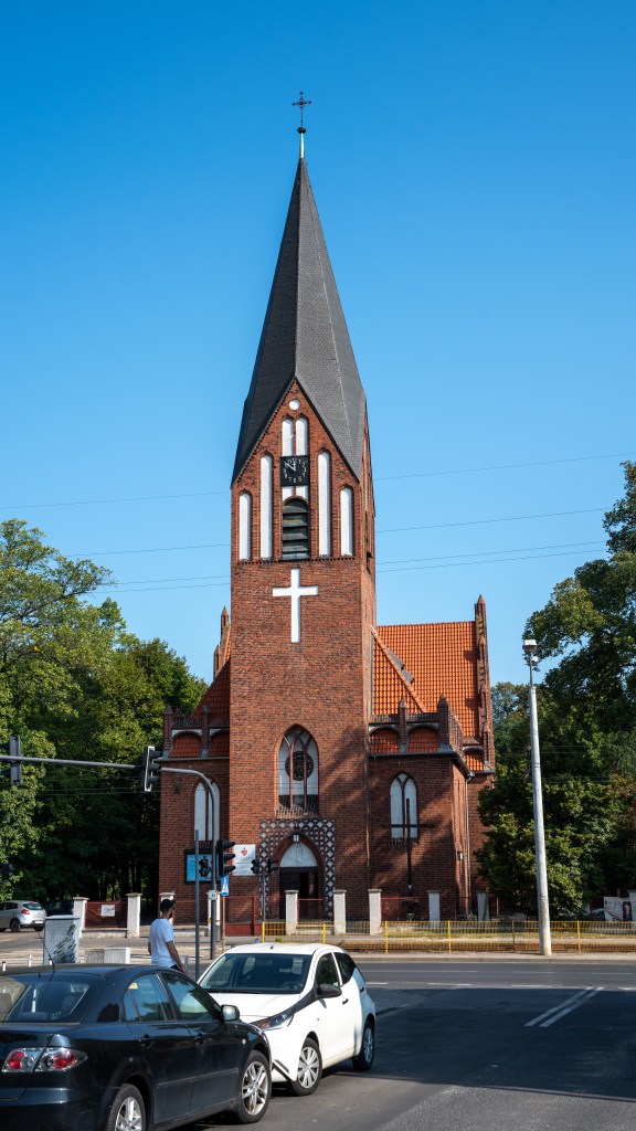 Miłośnicy architektury sakralnej powinni przejść się dookoła świątyni. Przede wszystkim dlatego, że bardzo ładnie wyglądają szczyty, wieńczące transept (czyli tę poprzeczną część kościoła, oddzielającą nawę główną od prezbiterium). Sporo tutaj niewielkich „wieżyczek” i blend. Ciekawy jest także „murek”, wieńczący skraj dachu, umieszczony nad oknami, które z kolei zdobią maswerki. Na zapleczu obiektu znajduje się także plebania, utrzymana w modernizującym stylu – wybudowano ją na przełomie lat 50 i 60. XX w. Niestety, oryginalna pastorówka, powstała w latach 1902-1904, do dziś nie przetrwała.