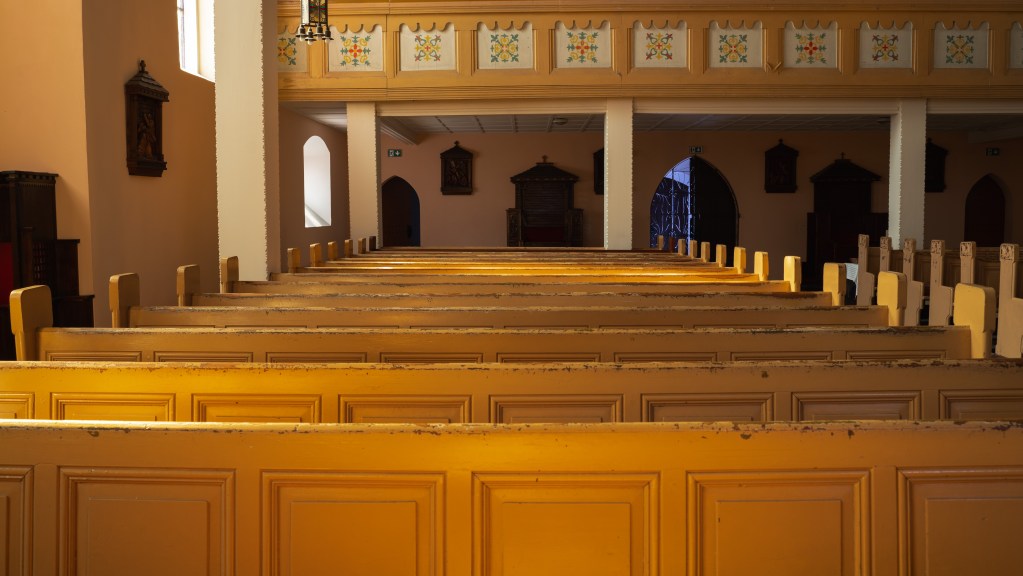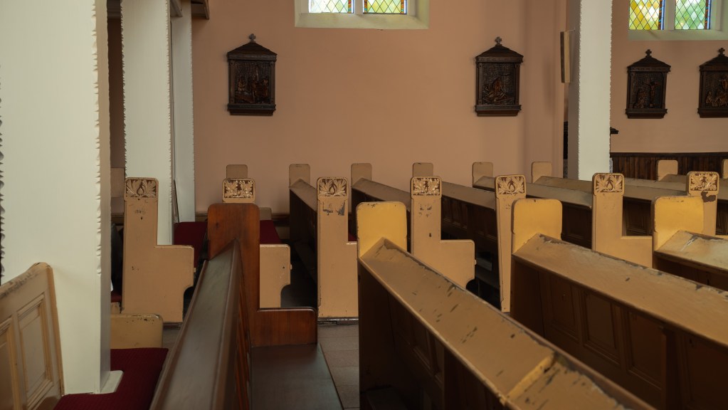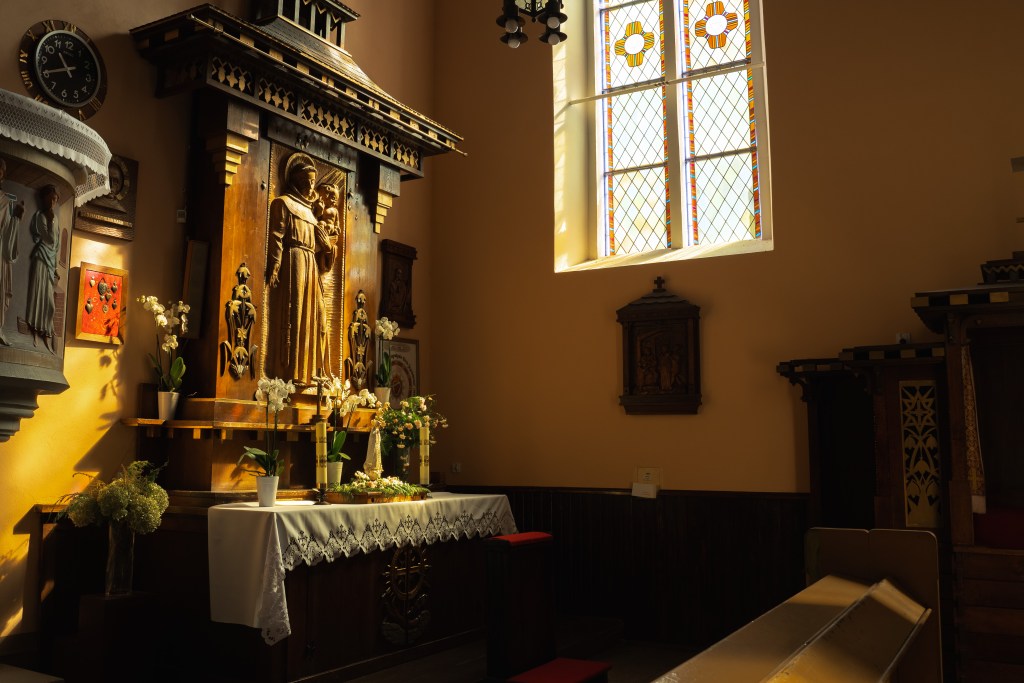 No własnie, ławki. Kiedyś było ich tutaj więcej, jednak te które przetrwały wojenną zawieruchę, służą wiernym do dziś. Niestety, jak to dawniej bywało, pomazano je mało estetyczną, olejną farbą. Doprawdy nie wiem, skąd wziął się ten zwyczaj, ale za komuny stosowano go dosłownie wszędzie. Na szczęście, okazuje się, że możliwe jest przywrócenie ławek do stanu oryginalnego! W 2024 r. udało się – przy wykorzystaniu specjalnego laseru – oczyścić jedną z nich i dziś zdecydowanie wyróżnia się ona na tle pozostałych. Oczywiście pozytywnie. Dodawać nie muszę, że proces ten, jest bardzo kosztowny, toteż zapewne parafia będzie go prowadziła, w odniesieniu do pozostałych mebli, etapami.