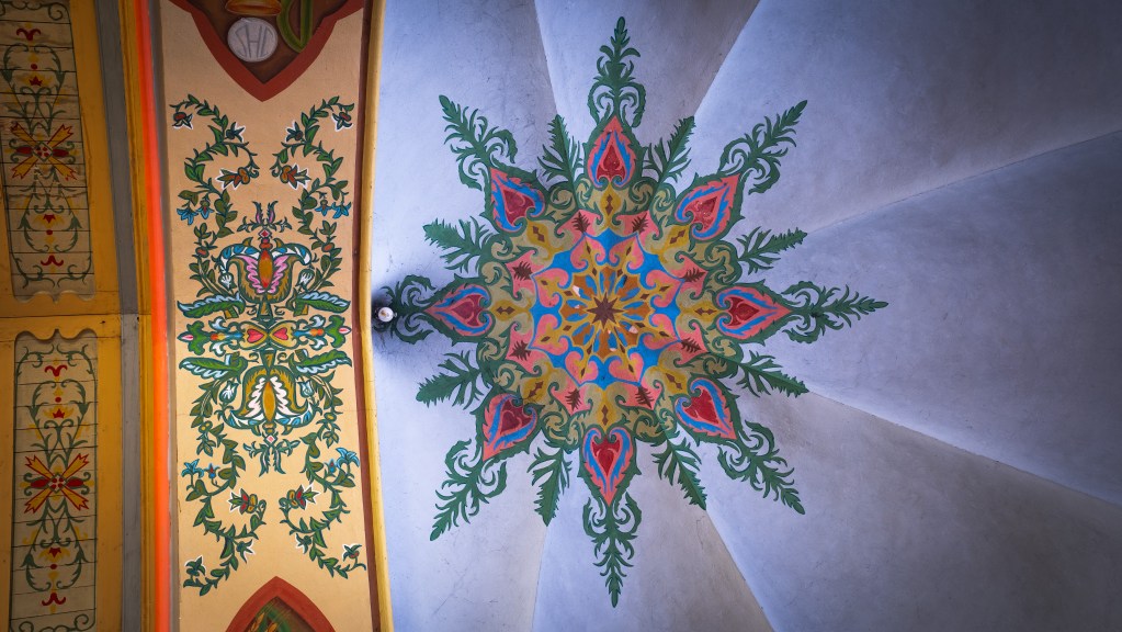 To, co w kościele Miłosierdzia Bożego najpiękniejsze, znajduje się w górze! W pierwszej kolejności, na myśli mam sklepienie. To, wyłożone jest niewielkim drewnianymi kasetonami, na których widnieją roślinne akcenty. I trzeba przyznać, że prezentują się one naprawdę pięknie, szczególnie po przeprowadzonych w 2022 r. i 2024 r., pracach renowacyjnych. Motywy roślinne znajdują się także na balustradzie chóru.