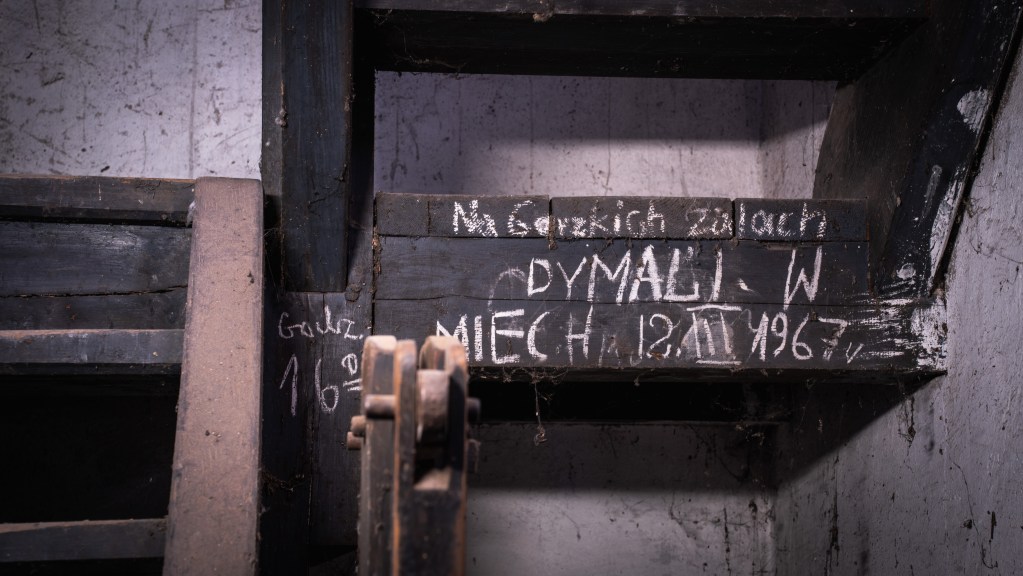 …innego świata! A raczej na najniższy poziom wieży, skąd wdrapać możemy się na sam jej szczyt! Przechodząc przez nie, przez chwilę widzimy jeszcze „wnętrzności” organów, w postaci skomplikowanej (przynajmniej dla oka laika) plątaniny belek i przewodów, aby po chwili dostać się na niewielką klatkę schodową. Tutaj zaczynają się strome, drewniane schody, ale jest też i mała ciekawostka. Na tyle jednego ze stopni, widnieje wykonany kredą napis: „Na gorzkich żalach dymali w miech”, i data „12.03.1967 r.”! Rzecz dotyczy oczywiście wprowadzania powietrza w organy, za pomocą specjalnych „pedałów”, a używając fachowej nomenklatury: urządzenia do kalikowania.