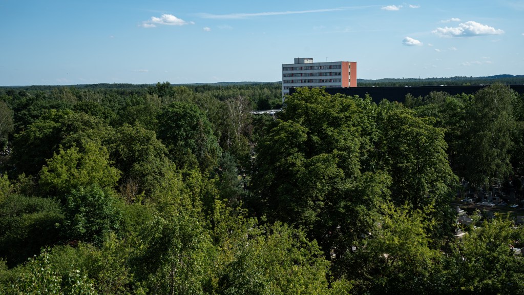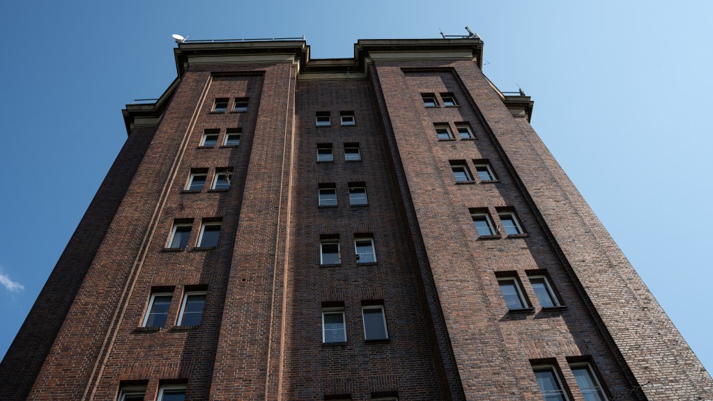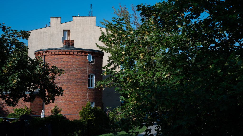 Ruiną nie jest za to młodsza z wież, stojąca przy ulicy Akacjowej. Tę wybudowano w latach 1941-1943, dzięki niewolniczej pracy jeńców brytyjskich i rosyjskich. Wzniesiono naprawdę imponującą, 10-poziomową konstrukcję, którą dostrzec można z wielu kilometrów. Co jednak najciekawsze, budynek został po wojnie, przystosowany do pełnienia funkcji mieszkaniowej i taką pełni po dziś dzień! Zamieszkanych jest jednak tylko 5 kondygnacji, gdyż pozostałe zajmują wielkie zbiorniki na wodę. W środku nie ma windy, w związku z czym szczerze współczuje mieszkańcom, zmuszonym wspinać się codziennie na wysokie piętra budynku. Nam udało się dotrzeć na 5 kondygnację, gdzie znajdują się drzwi techniczne z napisem: „Wieża ciśnień. Nieupoważnionym wstęp wzbroniony”.