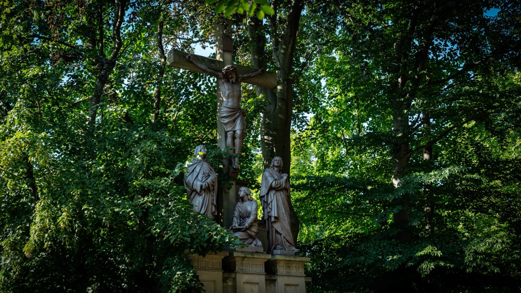 Co istotne, nekropolia została założona w miejscu, w którym znajdował się wspomniany wyżej kościół pw. św. Anny z początku XVII w., wokół którego z pewnością również znajdował się (wzorem lat dawnych) cmentarz. Kościół stał dokładnie w miejscu, w którym w obecnie podziwiać można zespół rzeźb Golgota (w skład którego wchodzą rzeźby: Marii, Marii Magdaleny, Jan Ewangelisty oraz krzyż), który umieszczono tutaj w 1911 r. Rzeźba stanęła dzięki staraniom księdza Józefa Domachowskiego, a jej elementy sprowadzono z Francji i Belgii.