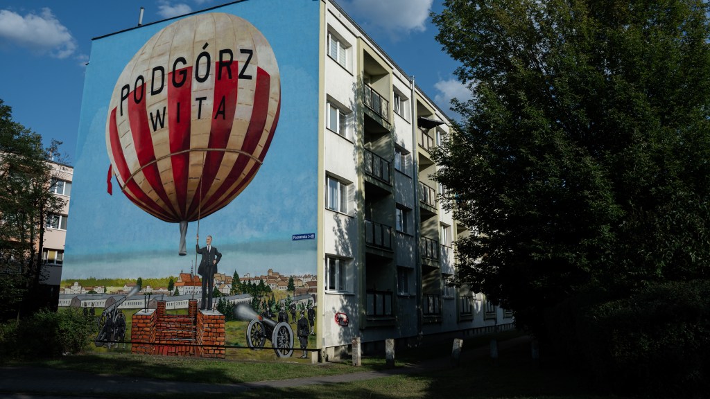 Malunek przy ul. Podgórskiej jest młodszy, bo powstał w 2023 r. i nosi nazwę „Duch Podgórza”. I faktycznie, tego ducha tutaj czuć, bowiem na muralu widać: armaty, stanowiące nawiązanie do poligonu, budynki dawnych koszar (miasteczka poligonowego), kościół, a w oddali panoramę toruńskiego Starego Miasta. Nad wszystkim tym unosi się balon z napisem „Podgórz wita”, co z kolei odnosi się do faktu, iż w sąsiedztwie poligonu (o którym piszę niżej), u styku ulic M. Drzymały i Okólnej, znajdowała się duża hala balonowa. Powstała w 1909 r., a wyburzono ją w połowie lat 50. XX w.