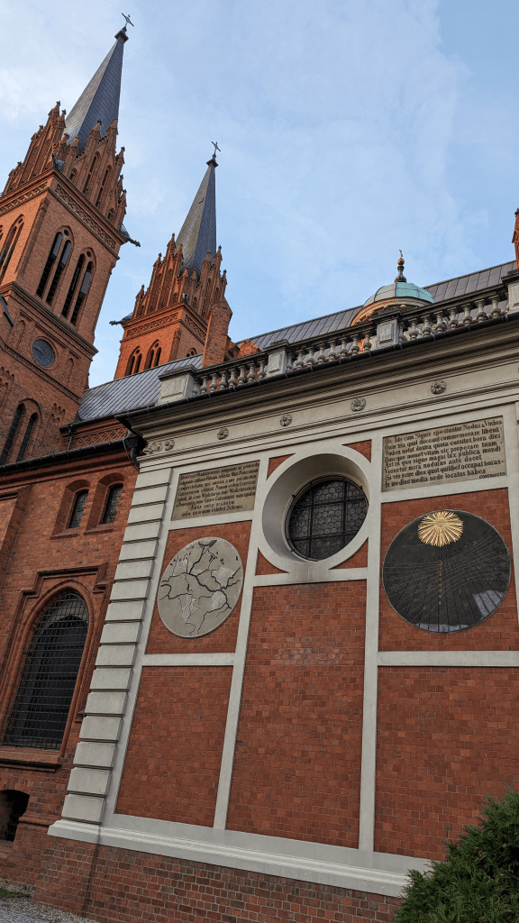 Zanim zakręci się Wam w głowie, spójrzcie na kilka innych, ciekawych elementów, znajdujących się na fasadzie kościoła. Dla przykładu, na północnej ścianie, znajduje się tablica poświęcona papieżowi Piusowi XI z 1929 roku. To wspomnienie po wizycie duchownego (wtedy jeszcze nie papieża), we Włocławku, która miała miejsce w 1918 roku. Z kolei po drugiej stronie znajduje się tzw. ściana kopernikowska. Umieszczono tutaj dwie ciekawy płyty – na pierwszej widnieje zegar słoneczny, a na drugiej mapa z granicami diecezji włocławskiej oraz cytatami wielkiego uczonego, również związanego z Włocławkiem, czyli Mikołaja Kopernika.
