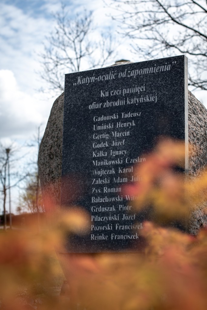 Są więc nazwiska żołnierzy, są zwykłych mieszkańców, którzy zostali brutalnie zamordowani przez niemieckiego okupanta. Obok stoi z kolei głaz z tablicą, upamiętniającą ofiary zbrodni katyńskiej – efekt działań drugiego – tym razem rosyjskiego – okupanta.