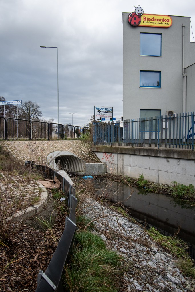 Na koniec chciałbym wspomnieć o prawdziwym podziemiu. I nie mam na myśli żadnej przenośni. Chodzi bowiem o potok Niziny, który niegdyś spływał sobie spokojnie piękną dolinką o takiej samej nazwie, a obecnie (być może w dalszym ciągu spokojnie) toczy swoje wody podziemnym kolektorem, wychylając się na powierzchnię na ledwie kilkaset metrów, tuż obok hali Łuczniczka. Chwilę później (po drodze zasilając jeszcze dwa niewielkie stawy) uchodzi do Brdy. Jego źródła znajdują się w okolicach bydgoskiego lotniska, a o dawnym biegu przypominają obecne Aleje Jana Pawła II. Więcej o tym sympatycznym cieku pisałem TUTAJ.