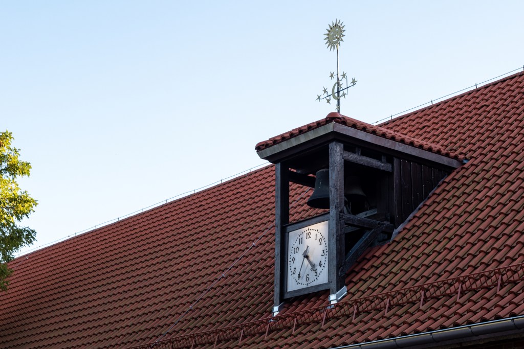 Ciekawie jest też, kiedy spojrzymy wyżej. Na południowym skrzydle umieszczono bowiem niewielką niby-sygnaturkę. Ten przedrostek „niby” wynika z faktu, iż de facto jest to drewniana dzwonnica (dzwon wciąż tam jest!), wyposażona w tarczę zegarową. A nad nią umieszczono urocze symbole: słońca, księżyca i gwiazd.