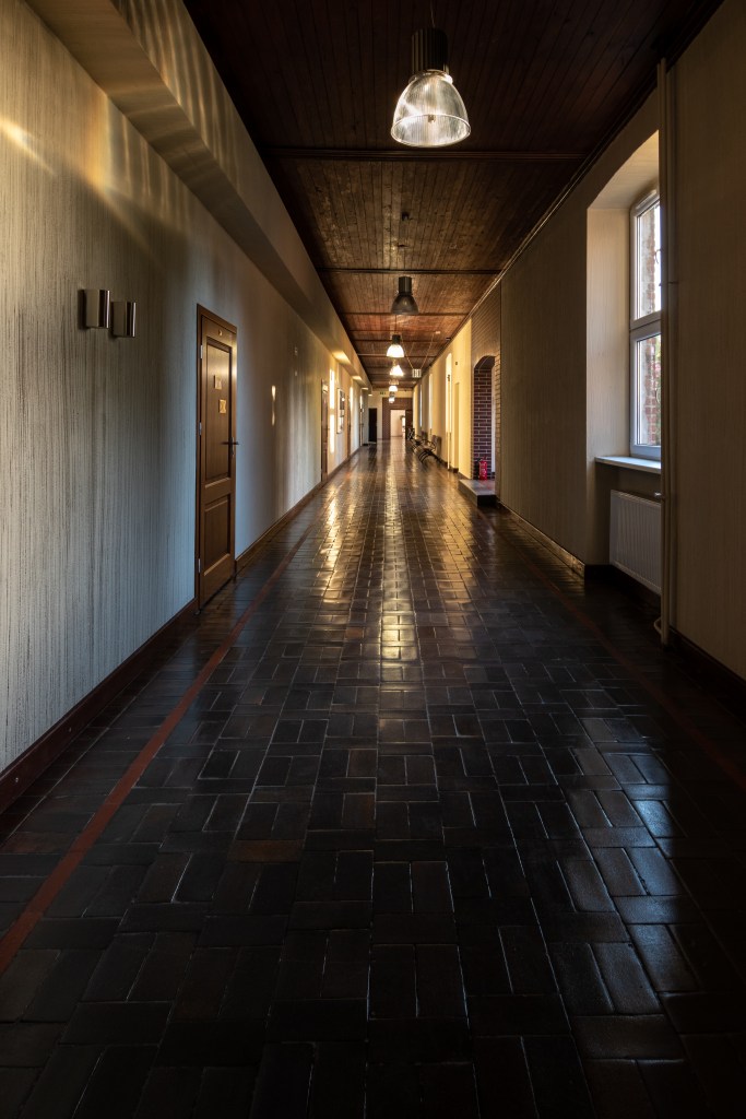 Powyższe dotyczy niestety głównie parteru, bo na wyższych piętrach wystrój jest już zdecydowanie bardziej współczesny. Na poddaszu z kolei natkniecie się na skośny dach, mogących utrudnić wędrówkę nieco wyższym osobom. Swoją drogą, właśnie poddasze i umieszczone w nim malutkie okienka, to świetny punkt obserwacyjny na okolicę. Stąd widać jak gęsta jest zieleń dziedzińca, i jak duża (no i słabo wykorzystywana) jest przestrzeń boiska.  Z tej perspektywy obserwować można także  dawną bibliotekę, a dzisiaj budynek dydaktyczny, który bije po oczy nowością (w pozytywnym sensie). Przez czysty przypadek udało nam się dojrzeć także niewielką figurkę – zdaje się że pozbawionego instrumentu muzyka – stojącą na jednym z parapetów.