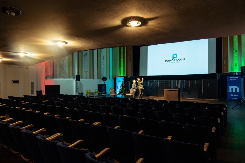 Najważniejsze jednak dopiero przed nami! Oczywiście mowa o sercu każdego kina, czyli głównej sali. Ta w „Pomorzaninie” to obecnie mieszanka starego z nowym. Nowe są: podłoga (no bo tę starą trzeba było zdjąć), ekran, a także całe zaplecze techniczne, czyli: projektor, nagłośnienie i światło.