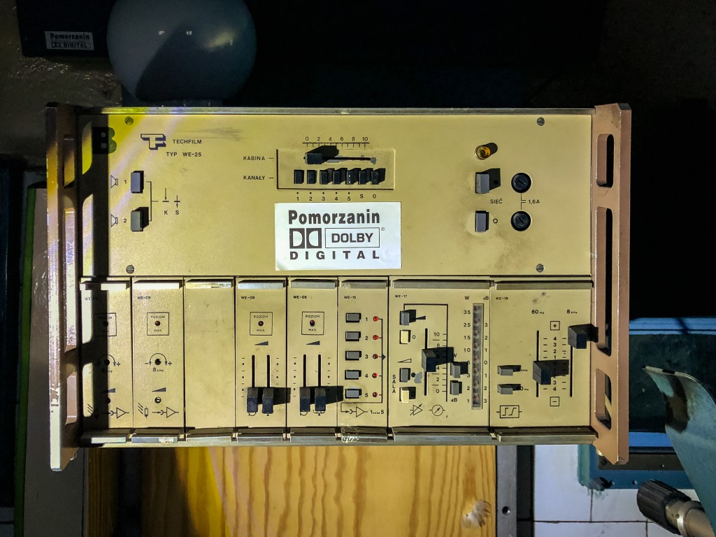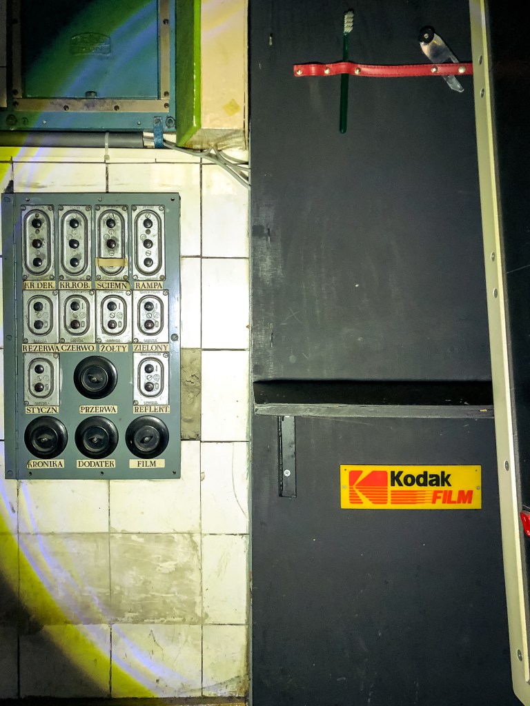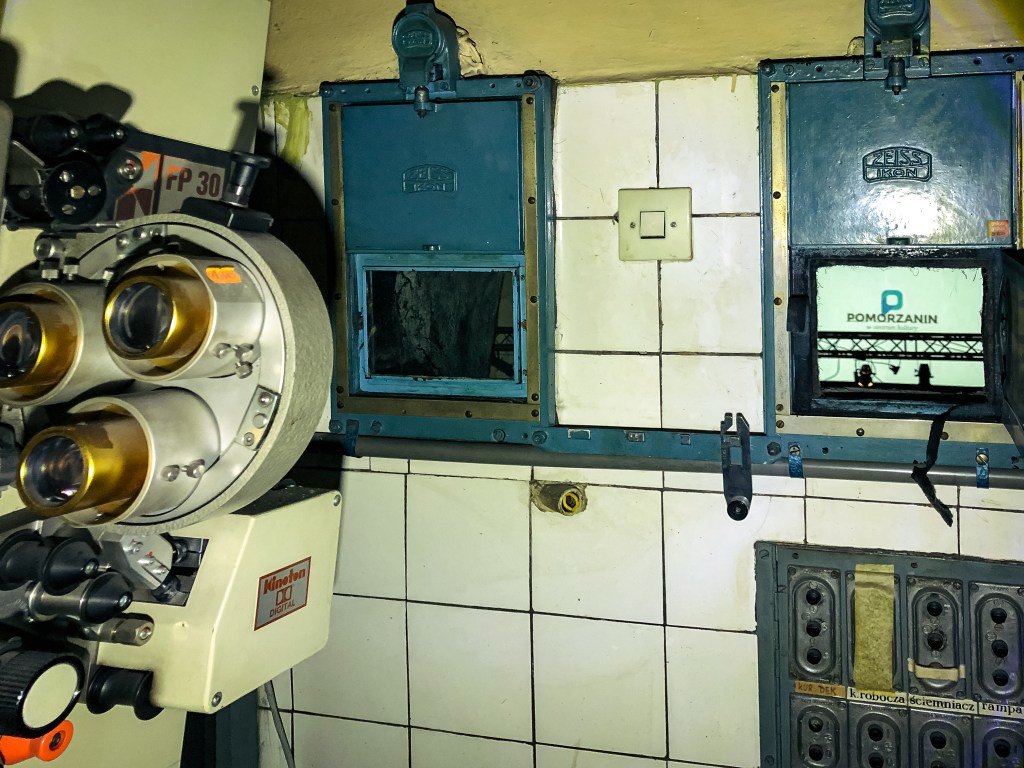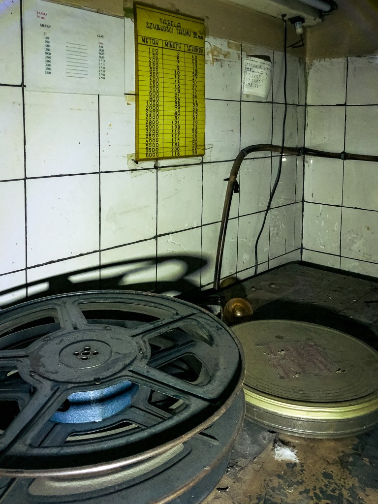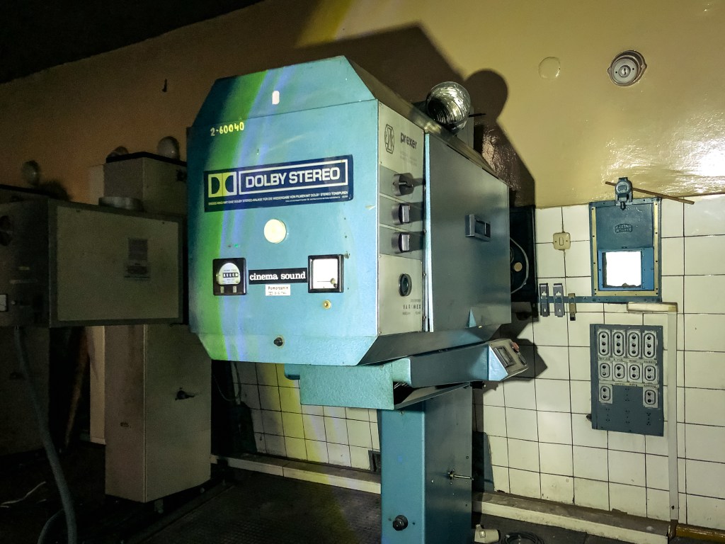 No więc, chyba mogło, bo najciekawsze, jak zwykle zresztą, czeka nas za zamkniętymi drzwiami! Wchodzimy więc do kabiny projekcyjnej. A tam „atakuje” nas wystrój rodem z początku lat 90. XX wieku! Znajdujące się na ścianach olejna farba i płytki już w momencie zamykania kina musiały być przestarzałe. Na szczęście, dzisiaj tylko dodaje to całości klimatu. Ale ten budują tutaj przede wszystkim oryginalne, wciąż przytwierdzone do ziemi (i co najważniejsze, działające!) projektory! Te, skierowane są na niewielkie okienka w ścianie, za którymi znajduje się już sala kinowa. Na największym z nich znajduje się duże logo „Dolby Stereo”.