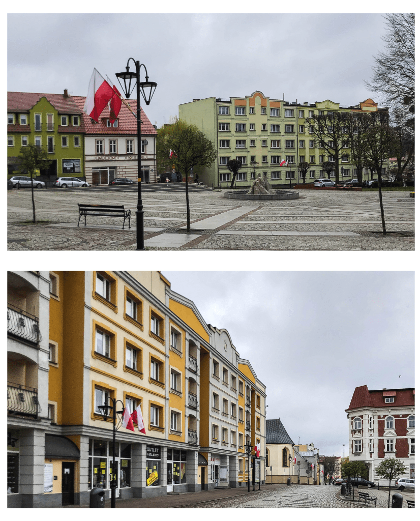 Z Wojska Polskiego już blisko na staromiejski rynek. Ten jest całkiem ciekawy, ponieważ dzięki zastosowaniu ciekawego układu ulic, krawężników i barwy podłoża, kształtem przypomina półokrąg (w rzeczywistości jest oczywiście kwadratowy). Na jego wschodniej pierzei zobaczycie mini parczek, a na samym środku znajduje się fontanna. Oczywiście całość została kilka lat temu zrewitalizowany za unijny hajs, dzięki czemu wygląda dość estetycznie. Niestety, spora część oryginalnych kamienic nie przetrwała wojny, a także „wyzwalania” miasta przez Armię Czerwoną, w związku z czym na północnej i zachodniej pierzei dominują współcześnie wyglądające, kamienicopodobne bloczki. Jest jednak kilka zabytkowych obiektów z przełomu XIX i XX w., jak kamienice: „Pod Pannami”, czy „Soldina”.